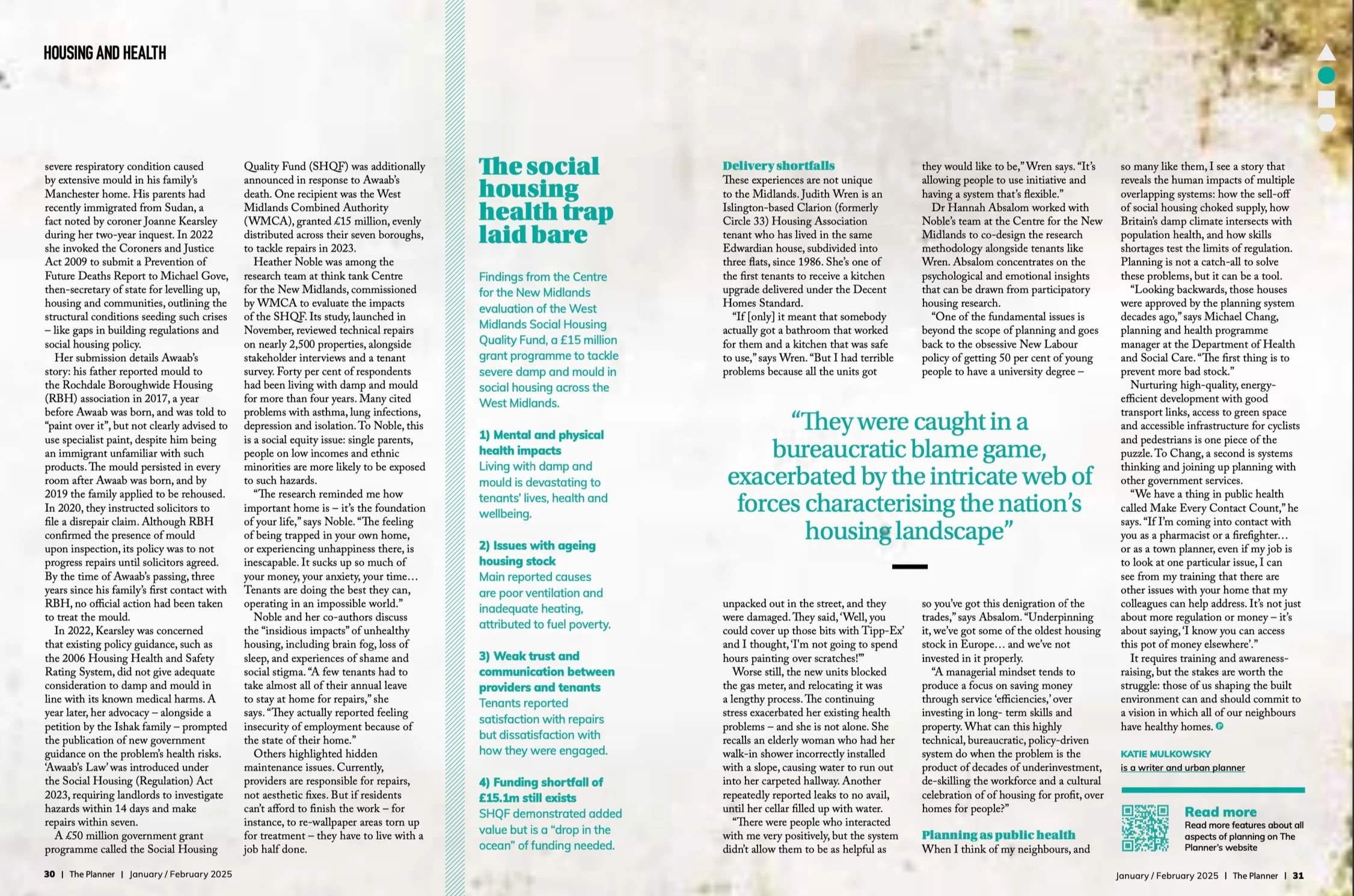 Sickness related to poor-quality housing is estimated to cost the nation £18.5 billion a year and disproportionately affects those on low incomes and insocial housing. Katie Mulkowsky asks how planning and public health can work together to spring the housing health trap. - The Planner, Jan/Feb 2025